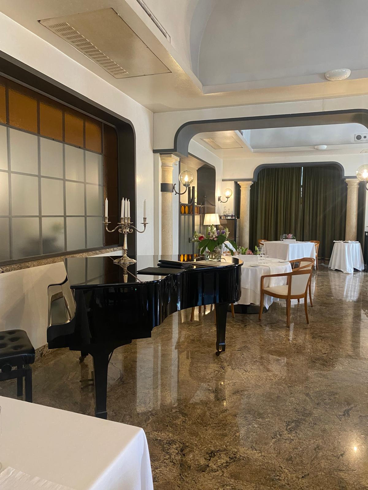 Pregiatissimi materiali, un arredamento neoclassico corredato da argenteria di grande pregio, tra cui quella necessaria per il servizio al gueridon (o alla russa), che ancora oggi è tra i primi complementi d’arredo ad attirare l’attenzione una volta varcata la soglia dell’elegante sala, insieme al pianoforte a coda che da quasi quaranta anni accompagna gli ospiti del ristorante.