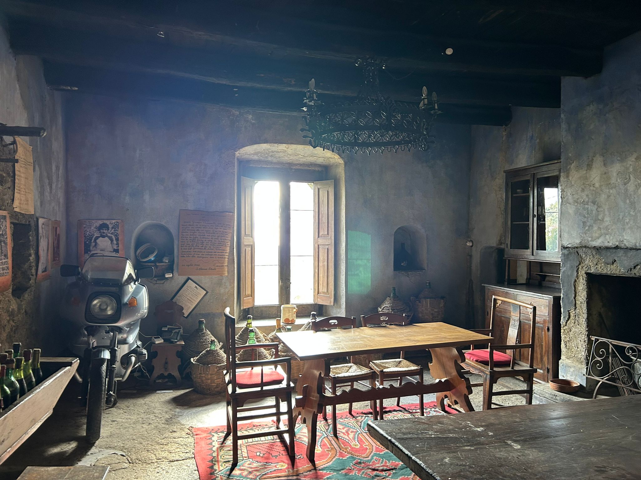 Gli arredi conservano tutto il fascino polveroso del tempo: i tavoli in legno massiccio, il forno a legna uguale a sé stesso da secoli, le botti, una botola che nasconde una stanza dove una volta venivano nascosti oggetti preziosi e cibo nei momenti di pericolo, passaggi segreti e grandi finestre che affacciano su un paesaggio straordinario.