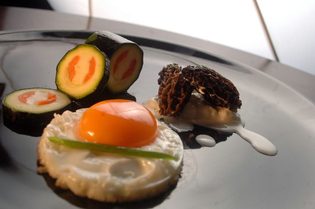 Riprendete la zucchine ed avvolgetela nel foglio di alga e tagliatela in diverse sezioni. Impiattate l’uovo fritto accompagnandolo con le spugnole e la zucchina ripiena.