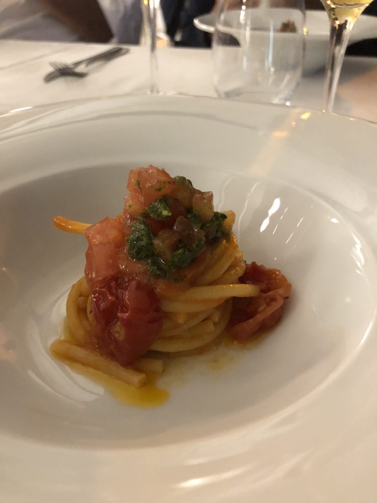 Lux – Caprese- scrigni di pasta fresca ripieni di mozzarella di bufala, pomodoro in tre consistenze e scampi crudi