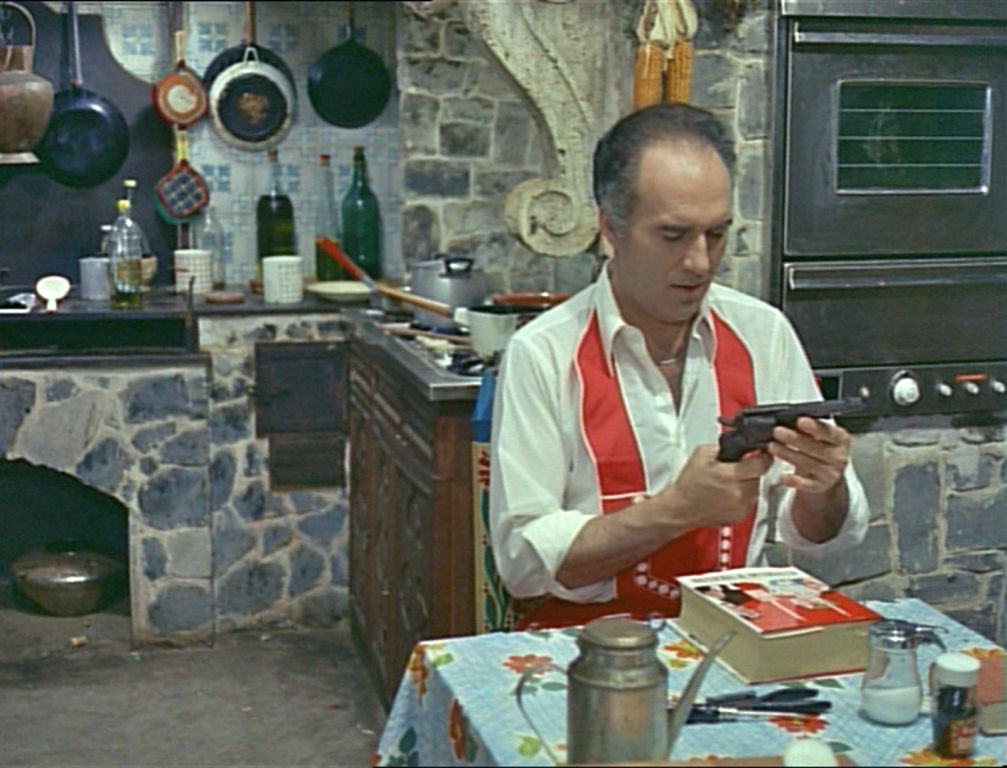 L’uomo ferreriano cerca nel cibo solo l’appagamento delle proprie frustrazioni. In Dillinger è morto (1969) la preparazione e consumazione di una solitaria cena notturna segna la cadenza della prima parte: insoddisfatto della poco invitante cena fredda lasciatagli dalla mogliettina (Anita Pallenberg), e in preda a una sottile irrequietudine, l’ingegnere Glauco (Michel Piccoli) «muta il desiderio in gastronomia», come scrive Tullio Masoni: sfoglia Il cucchiaio d’argento e si mette ai fornelli – la cucina è quella di casa Tognazzi, che Ferreri utilizzò come set assieme all’appartamento di Mario Schifano – per un sibaritico banchetto concluso con un’anguria e un barattolo di miele condivisi con la cameriera (Annie Girardot) in un deludente gioco erotico. Ma tra un manicaretto e l’altro, l’uomo ripulisce e lucida la vecchia pistola rinvenuta in fondo a un ripostiglio, che, opportunamente lubrificata (con olio extravergine d’oliva, quasi fosse una delicata pietanza) e ridipinta di color rosso a pois, servirà per sparare alla consorte.