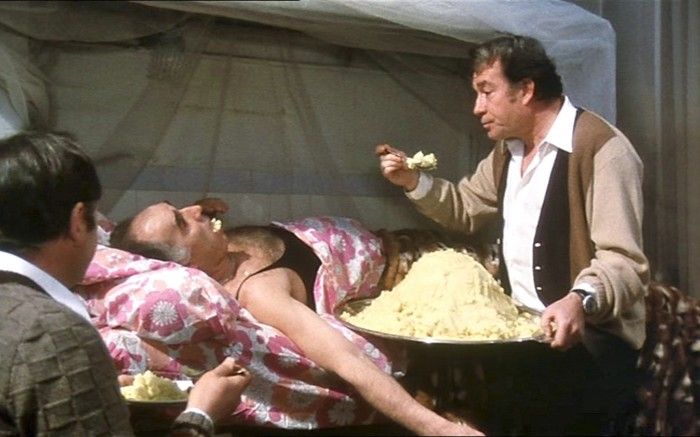 «Se non mangi, non puoi morire» dice Ugo Tognazzi in una scena; e ancora, mentre imbocca Michel Piccoli, dolorante e con il ventre gonfio fin quasi a scoppiare, con cucchiaiate di una colossale purea: «Immagina di essere un bambino di Bombay». In La grande abbuffata il cibo, come scriverà Tognazzi in L’abbuffone. Storie da ridere e ricette da morire, «entrava nelle interpretazioni di noi attori, così come le nostre interpretazioni erano strettamente legate al cibo, se non addirittura determinate da esso».