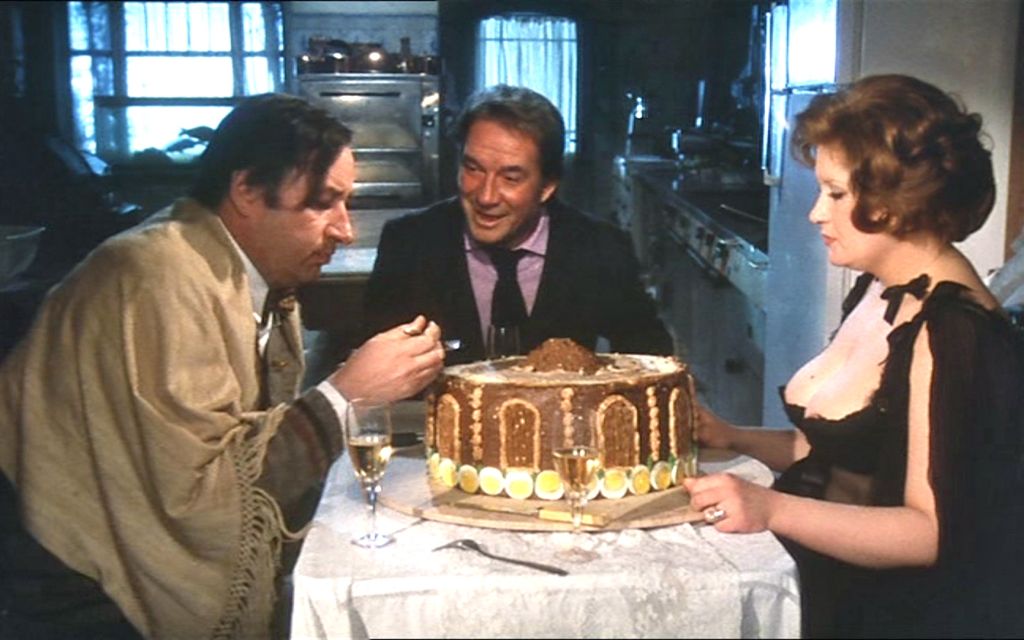 La rigida scansione delle giornate nella villa parigina dove si svolge il film, organizzate attorno a momenti conviviali a base di ghiottonerie sempre più barocche, anticipa Salò o le 120 giornate di Sodoma. E l’enunciazione dei cibi – le varietà di leccornie scaricate dal furgone del pizzicagnolo, o la complessa ricetta di un paté ai tre fegati (oca, anatra, pollo) letta con emozione da Tognazzi, a cui quel paté sarà fatale – fa parte di un rito preparatorio, ulteriore punto di contatto con la ritualità sadiana.