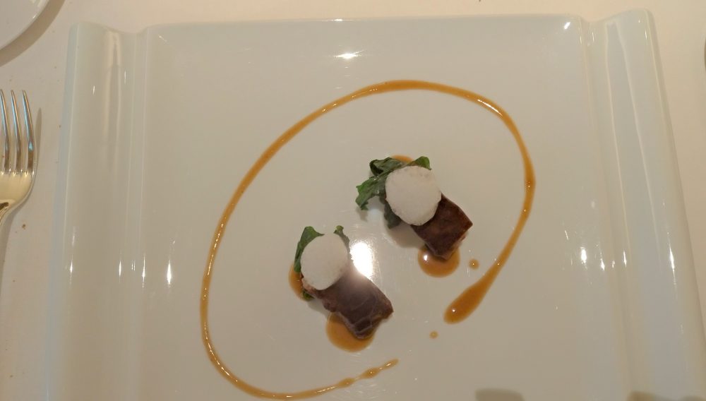 C’è uno spaghetto freddo allo zafferano, cicala di mare, lime e pepe rosa: un’invenzione cromaticamente elegantissima, ma che al sapore stupisce per l’inseguimento sensoriale di tutti gli elementi, sorretti da profumi perfettamente ad incastro e consistenze raramente percepite a tavola.