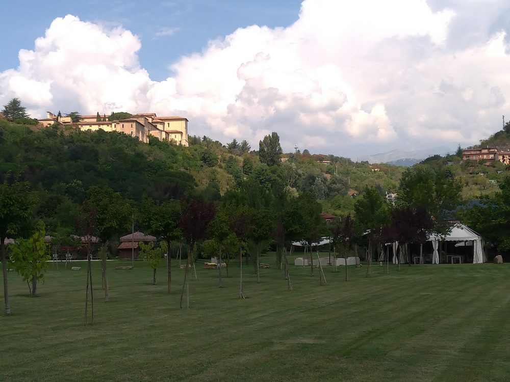 La location è molto bella. Un vecchio mulino completamente ristrutturato, immerso in una vasta e curatissima piana verde con piscina esterna, dalla quale, lassù, nella prima salita che porta al centro della città, si staglia la Basilica di Santa Maria di Collemaggio, imponente struttura del 13’ secolo, simbolo della città, che custodisce le spoglie del leggendario Papa Celestino V.