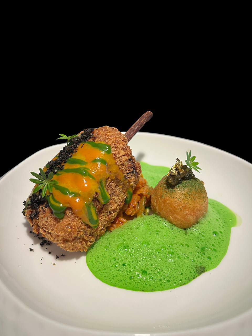 Su un piatto, disporre a nido il kimchi di scarola – leggermente saltato in padella – e adagiarvi sopra il Magnum di tonno. Glassare con le salse di pomodoro e basilico e decorare con la polvere di olive nere e le foglie di asperula. Riempire i bignè con la salsa al pomodorino e bottarga piccante e decorare con la polvere di prezzemolo, una quenelle di caviale di storione, una foglia di asperula e una fogliolina di oro edibile. Adagiare il bignè accanto al magnum di tonno e ultimare il piatto decorando con la schiuma di pesto di basilico.