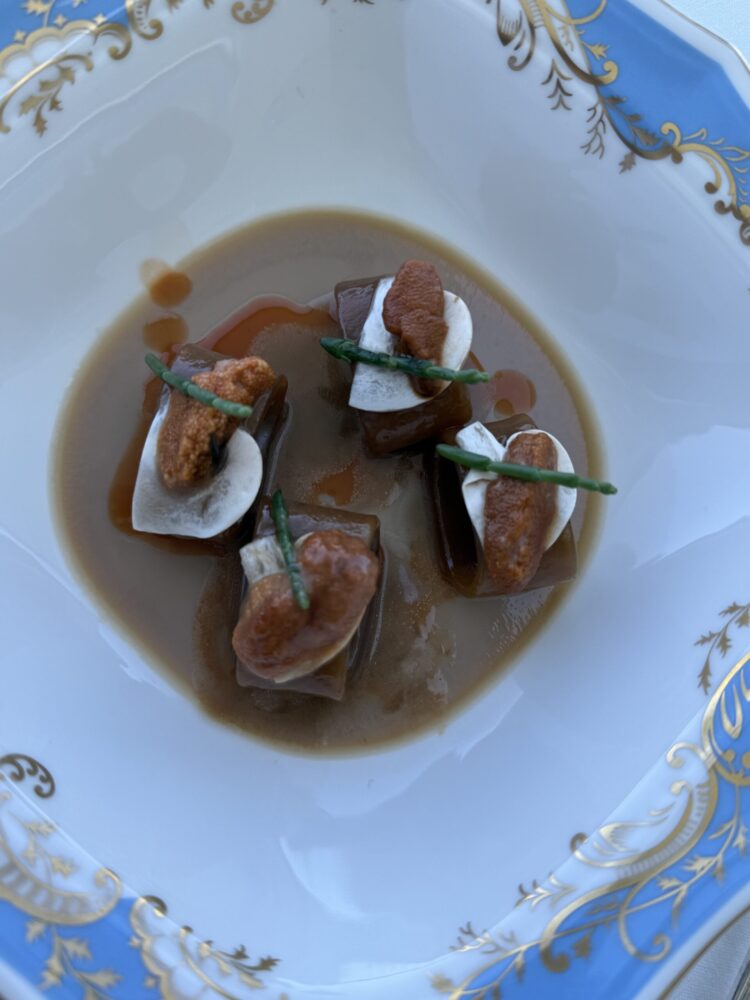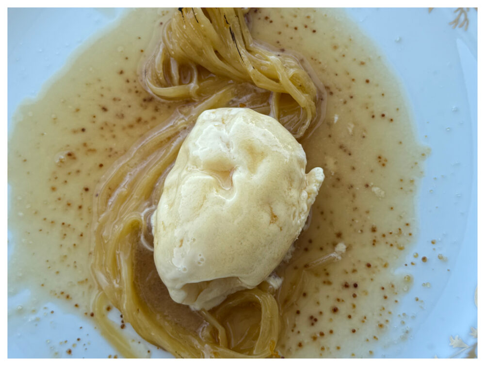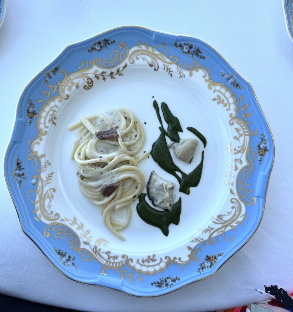 Grande intensità per la calamarata ricci e salicornia con una salsa di pomodoro e torna ancora il fungo champignon. Non da meno il dolce che porta la pasta al centro del piatto prendendo il posto di una classica crepes Suzette con un tagliolino mantecato con butto e limone e una quenelle di gelato al miele.