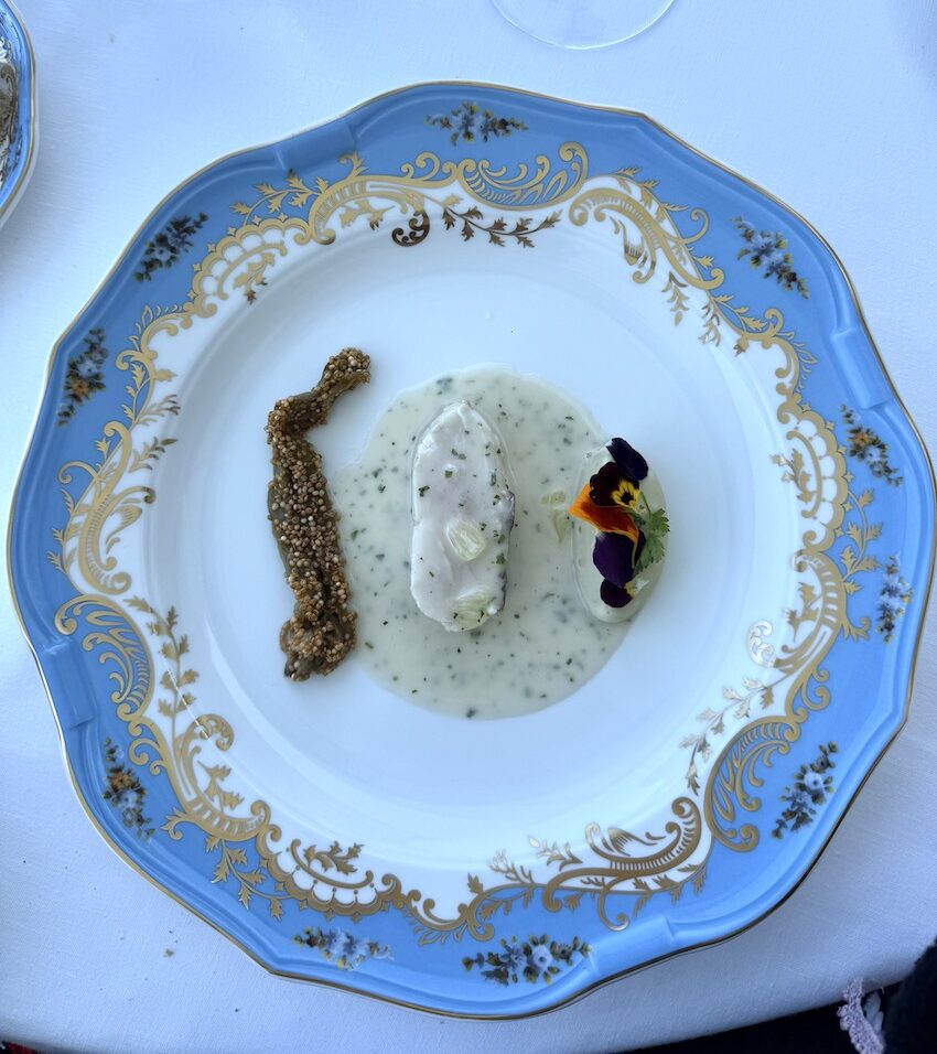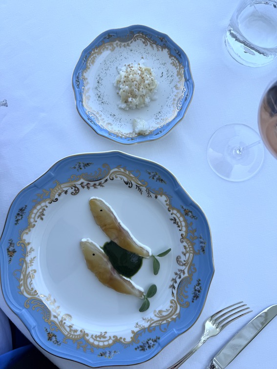 Il piatto che mi ha conquistato è stato il branzino crudo glassato all’acqua di pomodoro e adagiato su panna acida con salsa verde, una emulsione di spinaci, prezzemolo, dragoncello e levistico, sapori intensi, e accanto riso orientale, mandorla amara, quinoa e agrumi.