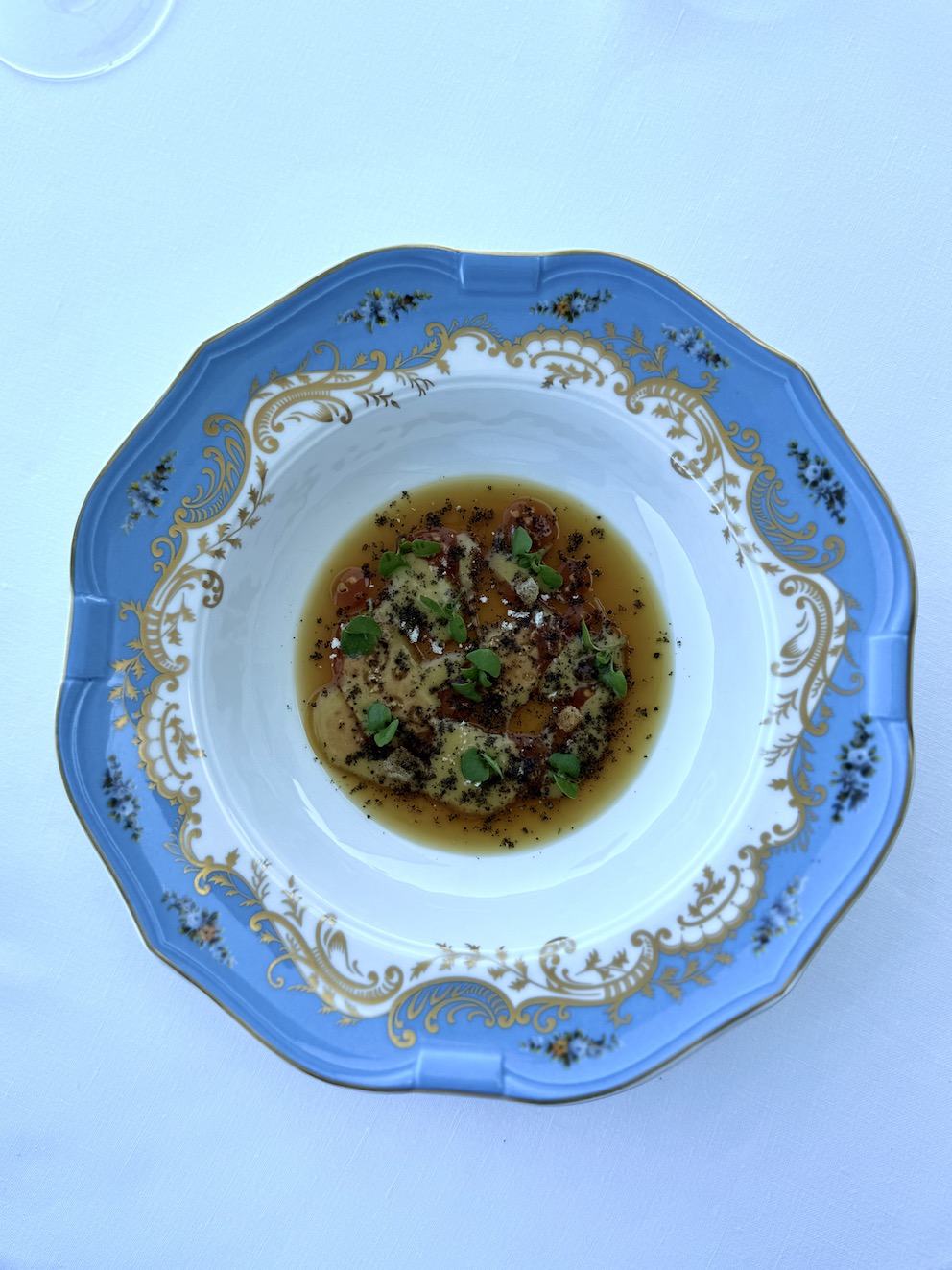 Il semplice pane e pomodoro diventa l’esperienza umami che parla di Puglia. Profumi che accendono la memoria di chiunque abbia condito una bruschetta in piena estate, ma qui il tutto è nello stile di Martino, dritto, autentico nella narrazione dei singoli sapori che si sentono tutti distintamente e che ti fanno venire voglia di non smettere mai. Ed è buonissimo questo gel al pomodoro, con parmigiano, basilico e polvere abbrustolita di pane.