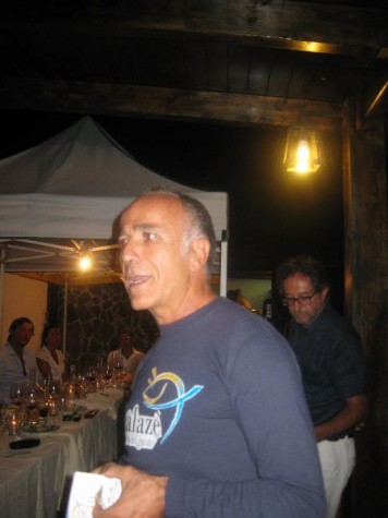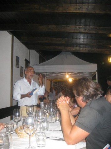 La cena è stata accompagnata da un pane dal sapore antico, di produzione di un forno a legna a Colli di Fontanella nelle vicinanze di Sant’Agata ed, in progressione i vini de La Sibilla: Falanghina 2010, Cruna del Lago 2009, una straordinaria promessa, Pedirosa, uno dei migliori rosati della Campania, Piedirosso 2010, Piedirosso per antonomasia, un campione di tipicità di cui diremo separatamente, un assaggio di Marsiliano e per chiudere Passio, il passito da falanghina. L’atmosfera familiare, scandita dal tintinnio dei bicchieri e delle posate, dal vocio dei commensali, dai versi e dalle letture di Escalona e Mangoni, ha avuto il suo apice, quando è comparsa una chitarra. Abbiamo conosciuto una nuova veste del serioso Arch. Escalona che ci ha trainati in pizziche e canti popolari di brigantesca memoria.