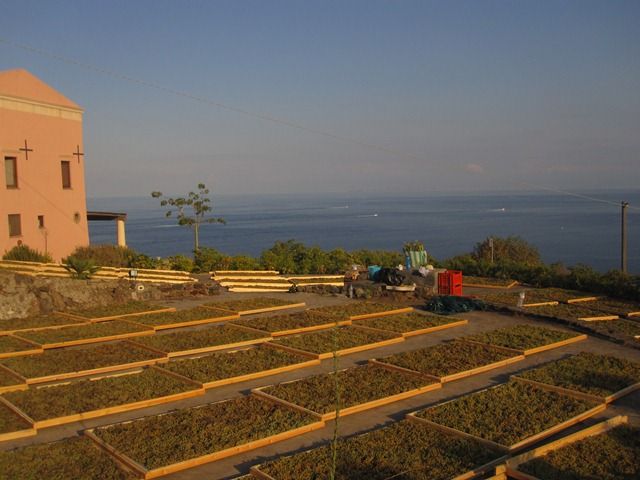 E’ giunto il momento di saperne di più e così, complice il momento di calma, Paola mi racconta la sua storia. Produce il suo passito a Vulcano, la terza delle isole Eolie per grandezza, nel terreno di sua proprietà dell’estensione di circa 8 ettari (di cui solo 5 sono vitati), nella località che prende il nome di Punta dell’Ufala. Paola parla del suo fondo come di un’oasi miracolosa, poiché ha resistito agli scempi urbanistici incontrollati degli anni ‘70 e ‘80 del secolo scorso, conservando la sua natura autentica e incontaminata. Il terreno è in declivio, abbastanza scosceso e prevalentemente sabbioso, l’acqua corrente non c’è, bisogna difendere le piante dai conigli selvatici e il sole estivo di Vulcano è di quelli che non perdona chi sceglie di lavorare sui terrazzamenti di fronte allo splendido mare blu di Sicilia. Nelle sue parole c’è il racconto di mille sforzi fatti (specie contro l’imponente burocrazia) e di tanta fatica spesa, ma anche la grande soddisfazione di essere riuscita nel proprio intento.