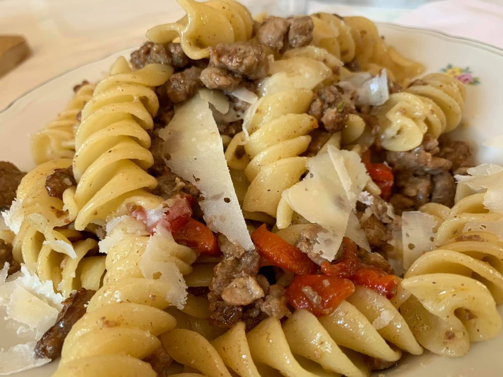 Occhio, carne e pasta. Un fusillone di Gragnano con la salsiccia e una idea di peperone con scaglie di Provolone del Monaco. Alè, un piatto più domenicale di questo?