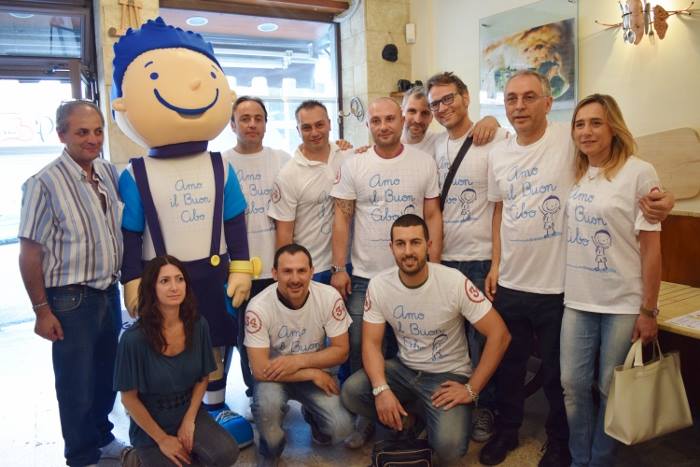 Dario Meo con la mascotte Daddà Galameo, Luisa Crisci dell’associazione Noi Genitori di Tutti ed i pizzaioli coinvolti nell’iniziativa