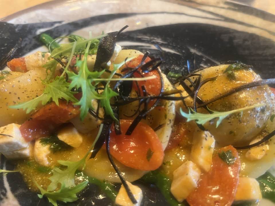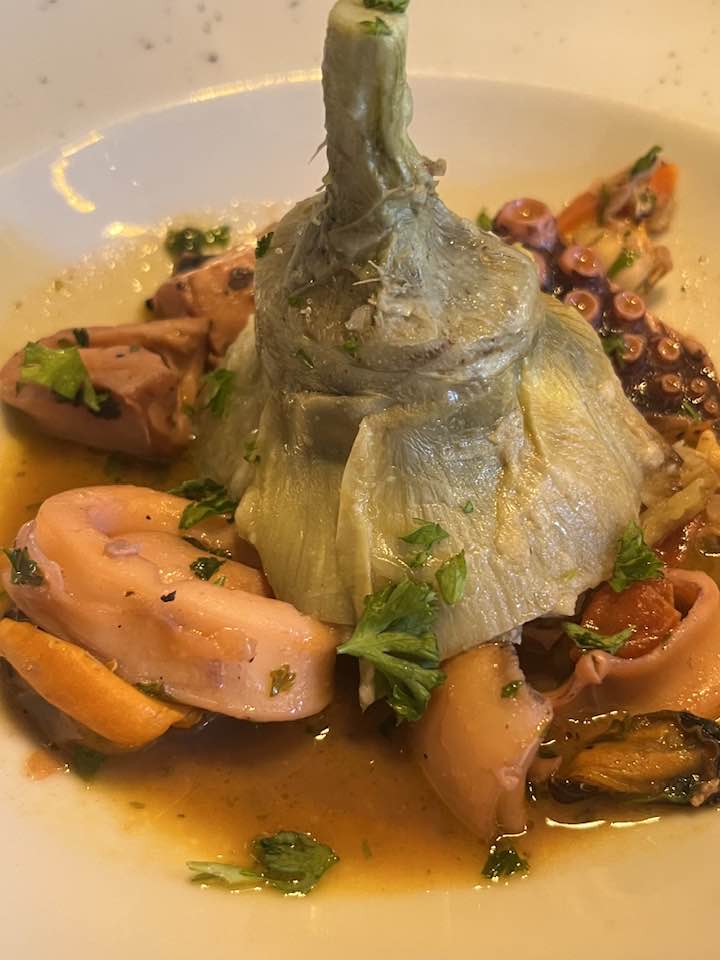 Piatto di grande impatto visivo ma anche palatale. Per poi continuare con un carciofo imbottito, in un sughetto di mare profumato e gustoso.
