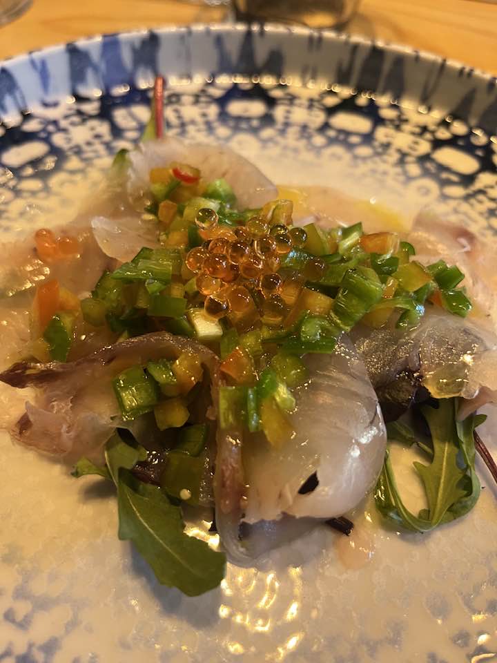 Dopo un benvenuto con delle sfiziosissime chips da intingere in una ancora più sfiziosa salsetta, complice un calice dell’asprinio di Salvatore e Gilda Martusciello, sempre una gran bel calice, si inizia a fare sul serio, con un bellissimo ma soprattutto buonissimo carpaccio di ricciola all’aperol.