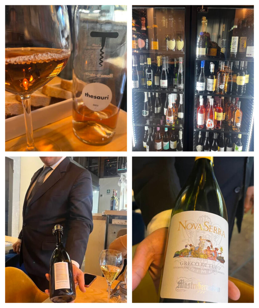 I secondi non ci sono nel menù ma c’è un secondo primo, uno gnocco chiuso che nella forma ricorda un tortellone, con pesce spada, mozzarella e buccia di melanzana. Molto buono, tendente al goloso, da accompagnare ad una stilla di rosato da uve tintore della cantina Tagliafierro di Tramonti, che ha la potenza e (quasi) il colore di un rosso.