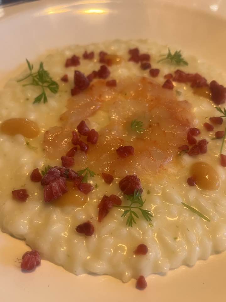 Il pane finisce e pure il calice di Asprinio ma Luigi è pronto con il Novaserra di Mastroberardino che terrò anche sul primo dei due primi: Risotto con emulsione di gambero, estrazione di mozzarella e lampone ghiacciato.