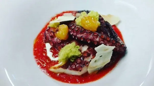 Riempire una pentola con acqua frizzante e acqua naturale, sedano, carote e cipolla. Al bollore immergere il polpo e farlo arricciare, proseguire la cottura per circa 45 minuti, lasciando al dente. Far raffreddare e poi tagliare alcuni tentacoli e piastrelli con olio, sale e rosmarino.