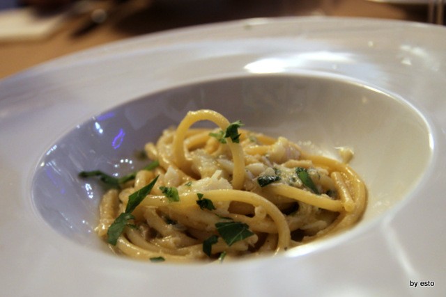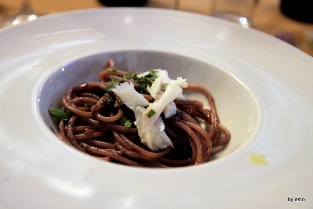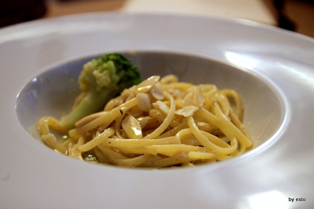 La linguina con cime di rapa mandorle e baccalà. Piatto appena appena più strutturato. Buono.