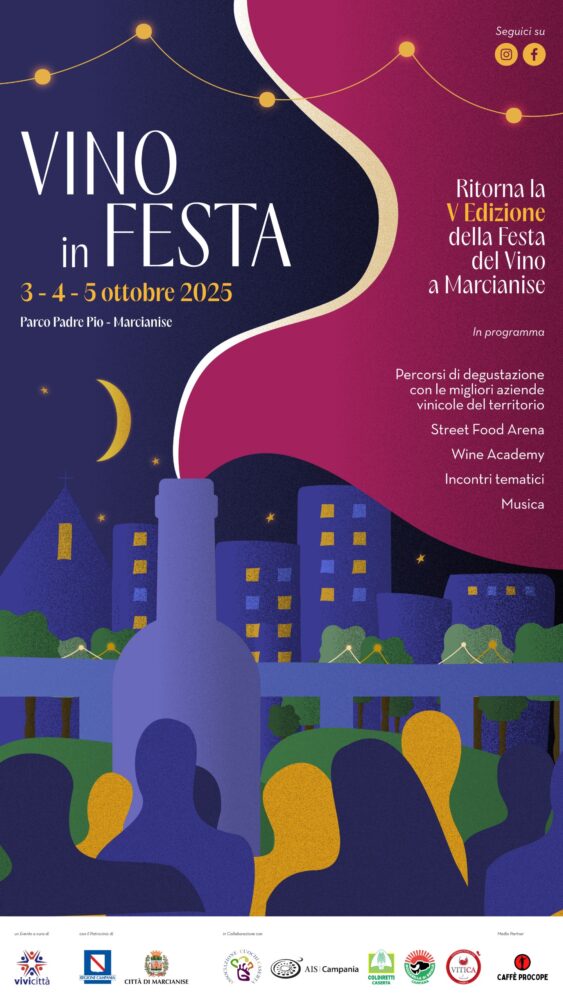 Marcianise si prepara ad accogliere la quinta edizione di “Vino in Festa”, un appuntamento ormai consolidato che celebra l’eccellenza vitivinicola e gastronomica della provincia di Caserta. L’iniziativa è promossa dall’Associazione Vivicittà, con il patrocinio della Regione Campania e del Comune di Marcianise, e la collaborazione di realtà di prestigio come AIS Campania, Associazione Cuochi Caserta, Coldiretti Caserta, Consorzio di Tutela della Mozzarella di Bufala Campana DOP e Consorzio Vitica.