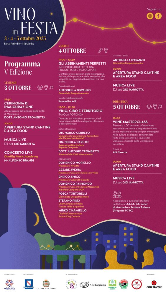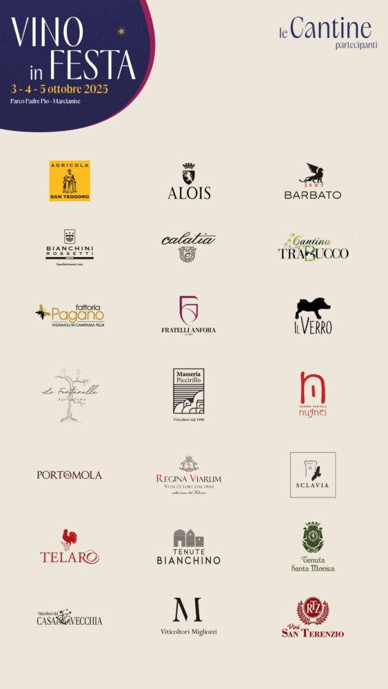 A rendere l’evento ancora più ricco sarà la partecipazione di oltre venti cantine campane che porteranno in degustazione il meglio della produzione vitivinicola del territorio. Tre giorni di festa, dal 3 al 5 ottobre 2025, in cui il Parco Padre Pio diventerà la cornice ideale per degustazioni, incontri, dibattiti e momenti di spettacolo.