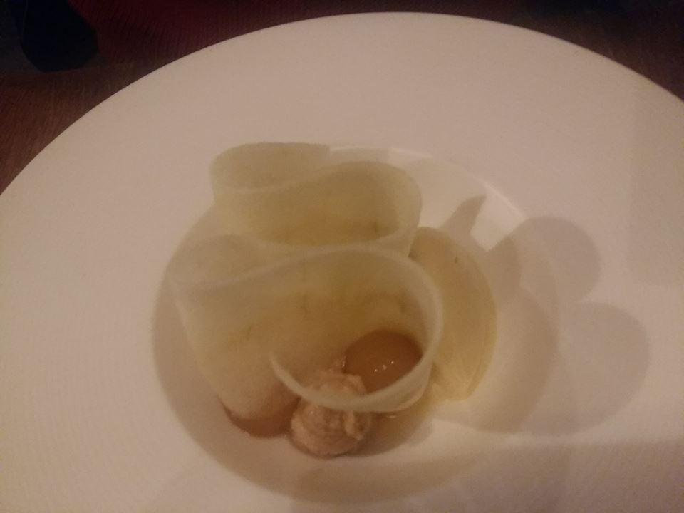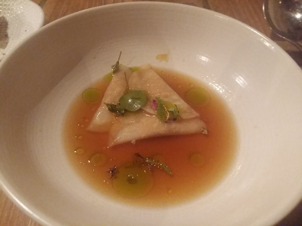 - raviolo di sedano in zuppa d’acciuga, prezzemolo, arachidi, lime