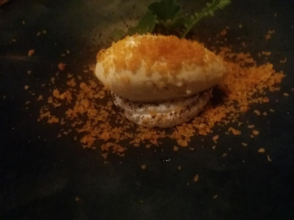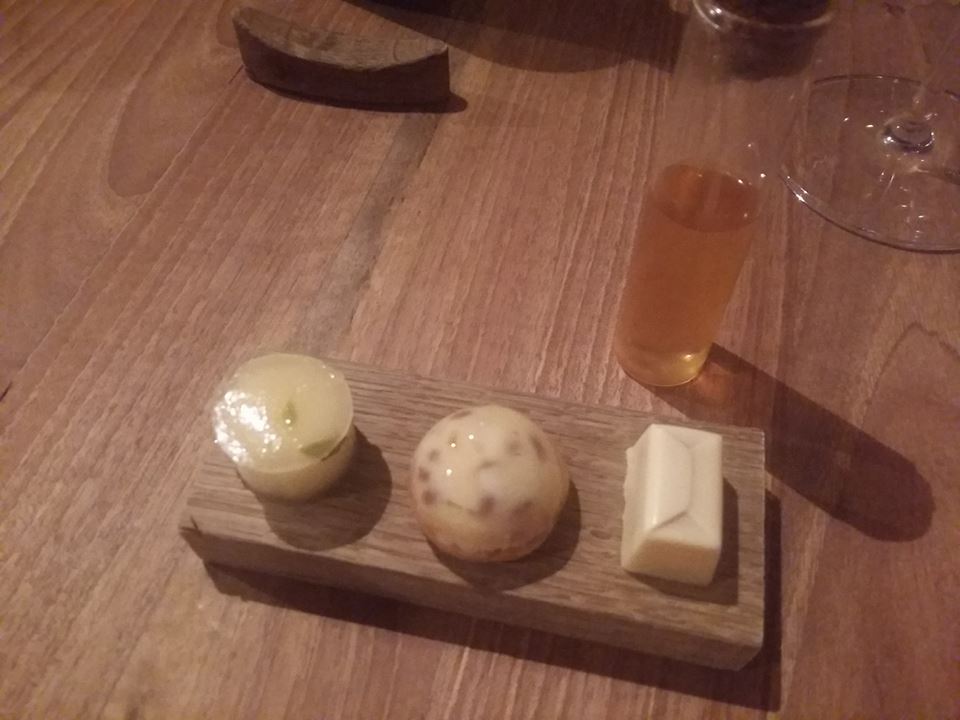 Marco Ambrosino, 28 posti Milano. Benvenuto- Infuso al marsala, capperi e timo; corallo di pomodoro; finta oliva; macarons di mandorla; sasso da leccare con emulsione di erbe.