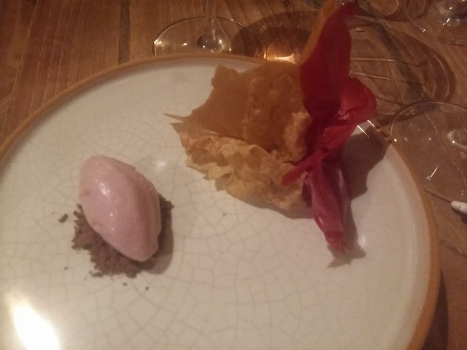 - Millefoglie cioccolato affumicato, cipolla, lamponi e sorbetto di aceto