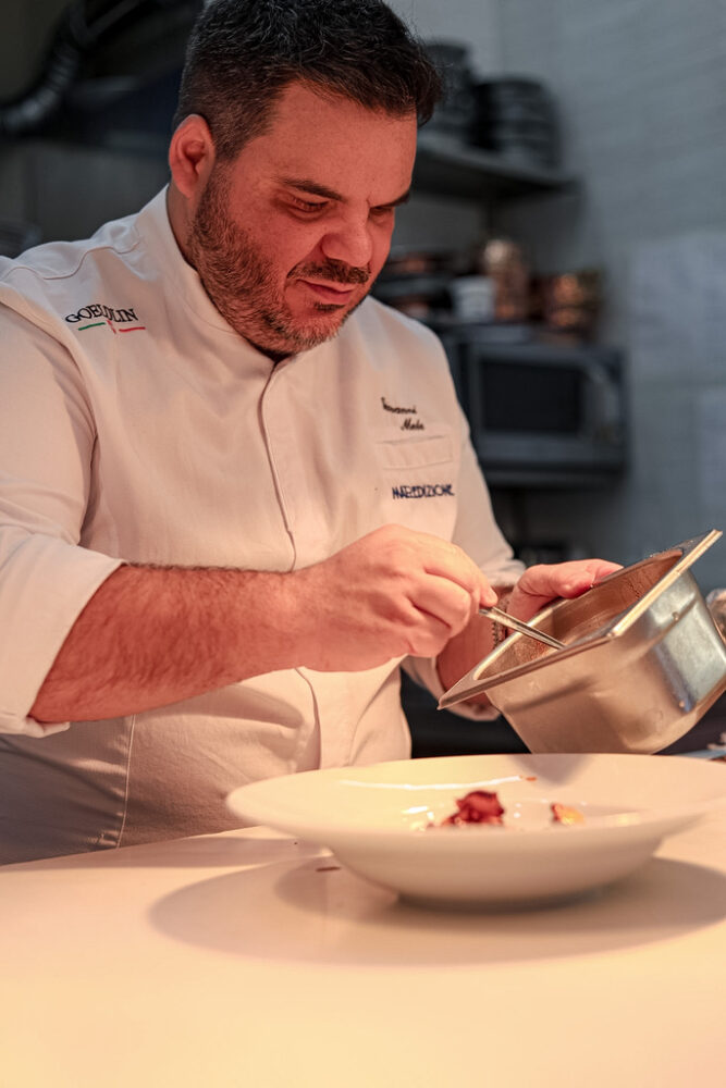 Viaggi, esperienze, cultura gastronomica: Francia, Spagna, Grecia, Portogallo. Sempre con un denominatore comune, il cibo come scoperta. Così il piacere di mangiare si trasforma in desiderio di cucinare, poi in studio, poi in scelta. Arrivano gli eventi. Le serate. Il contatto diretto. Giovanni vuole vedere le persone mentre mangiano, leggere le loro espressioni. Perché il cibo, per lui, è come il teatro: vivo, reale, condiviso. L’occasione decisiva arriva con un incontro importante quello con Leonardo De Luca. Da lì nasce un progetto che prende forma in pochissimo tempo. Il locale cambia volto, cambia anima, cambia nome. Nasce Maredizione. Una trattoria di mare che guarda alla tradizione napoletana ma anche oltre, con contaminazioni intelligenti e una forte identità. Oggi Giovanni non è più solo ai fornelli. C’è una brigata. Giovani, affamati, capaci. Lui coordina, assaggia, rifinisce, impiatta. Ma soprattutto lascia spazio.