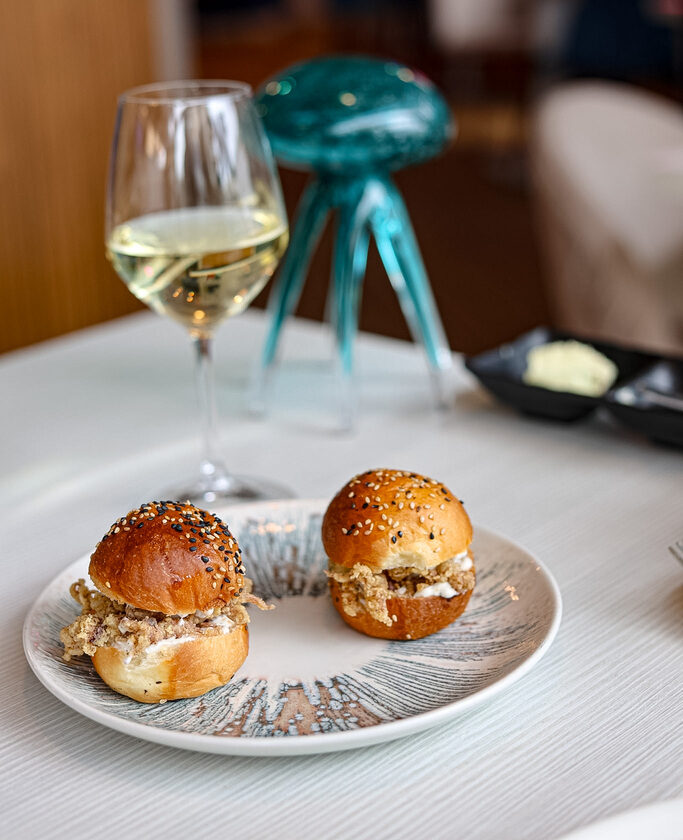 La degustazione inizia con il tagliere Maredetto: salumi di pesce che sorprendono per tecnica e gusto. Guanciale di ricciola, prosciutto di tonno, simmental di mare, accompagnati da burri aromatizzati che evocano il mare. Un inizio emozionante, capace di rompere gli schemi e stupire al primo assaggio.