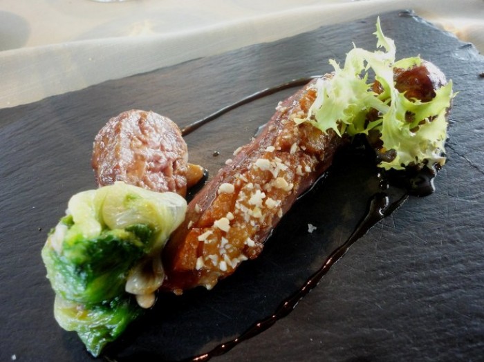 Si va per i secondi. Anatra in due cotture, scarole ‘mbuttunate, miele e pinoli. Eccellentissima materia prima, cotture rispettose della stessa e perfetta esecuzione del classico natalizio campano a base di scarola.