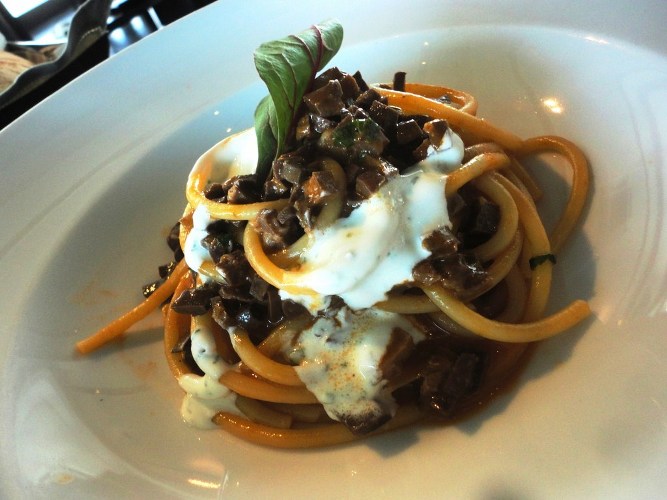 Qui c’è una piccola variante al piatto originale determinata dalla stagionalità, ci sono le ostriche al posto dei ricci. Il sapore del mare si sente tutto, ben fuso con la pasta(all’uovo) e con le rape. La spinta iodata delle ostriche completa il piatto.