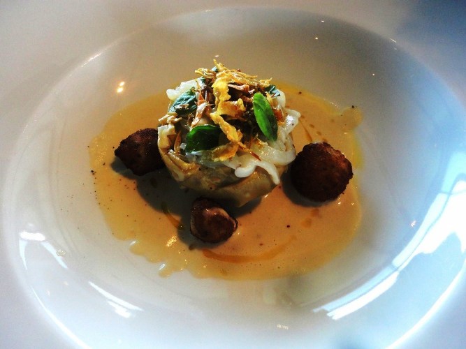 Chiaramente ho assaggiato anche l’altro antipasto ordinato dal mio commensale, Carciofi e seppie in salsa di bagnacauda. Anche qui perfetta sintesi tra le durezze(sapidità delle acciughe) e le morbidezze (dolcezza del carciofo), con l’aggiunta dello iodato delle seppie crude ad esaltare il tutto.