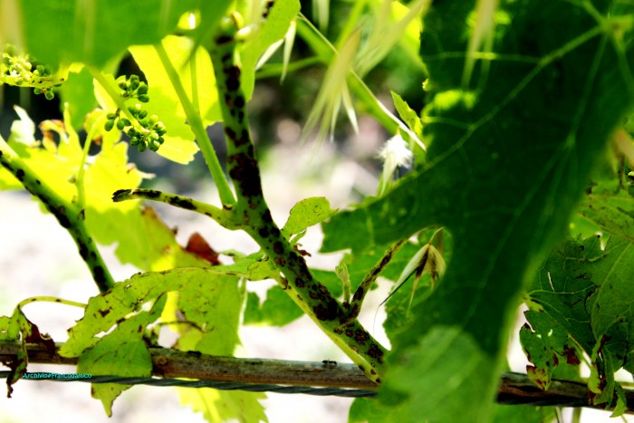 Alcuni tralci della vite colpita dalla grandine il 25 aprile 2016