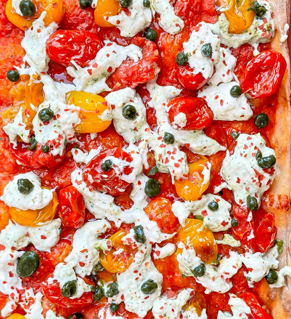 Stendere una pagnotta su una teglia ben oleata, aggiungere due mestoli di polpa di pomodoro affumicata sull’impasto e cuocere in forno per 10 minuti circa a 280/290 °C. Ultimata la cottura della pizza, adagiare sulla base i pomodorini datterini gialli e rossi. Aggiungere la stracciatella aromatizzata al basilico e posizionarla sopra ai datterini, senza però coprirli. Spolverare con le scaglie di pomodoro essiccato e infine adagiare le sfere di basilico per decorare il tutto.
