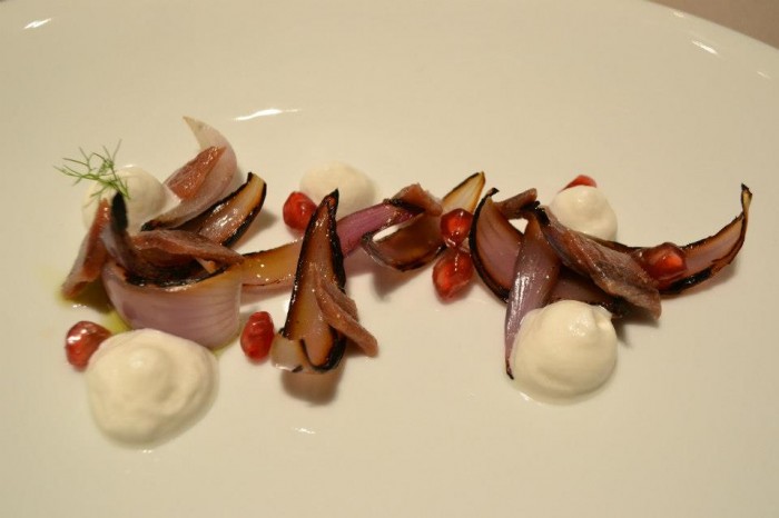 L’antipasto prosegue con cipolle, acciughe del Cantabrico, mandorle e melagrana, gioco semplice e seducente tra toni dolci e salati.