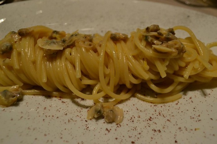 Come uno spaghetto a vongole è una piccola genialata che ci riporta il piacere di questo piatto molto gradito a Napoli dove la chef con astuzia compensa la carenza di sapore e sapidità dei lupini dei nostri tempi con acqua di mozzarella, aglio bruciato ed un sottile accento di limone.