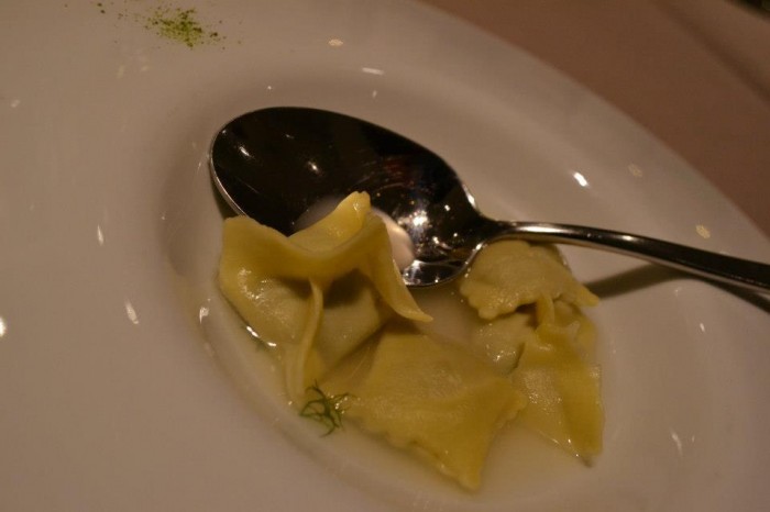 Raffinati i ravioli di minestra maritata in brodo di spigola affumicato.
