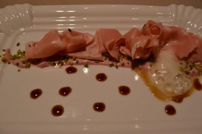 Prima provare poi parlare. Guarda come va il mondo, ma quella mortadella la vorrei assaggiare qui ora e subito. Immagino il gioco tra la tendenza dolce del grasso e la balsamica amaritudine del tamarindo, tra la freschezza del melograno e lo spunto del pepe. Un rimestamento papillare che, non dimentichiamolo, subito dopo troverà un cioccolato fondente e marmellata di cachi a metter le cose a posto. Pura curiosità, insomma: ché la gratuità astrusa sta da un’altra parte rispetto a Marianna Vitale.