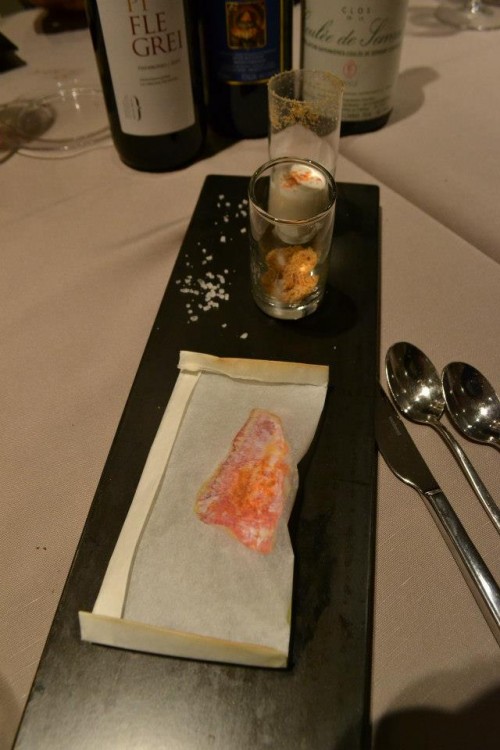Con la giusta armonia di forme Marianna ci riporta nel piatto il pesce al cartoccio: è una triglia con colatura di alici.