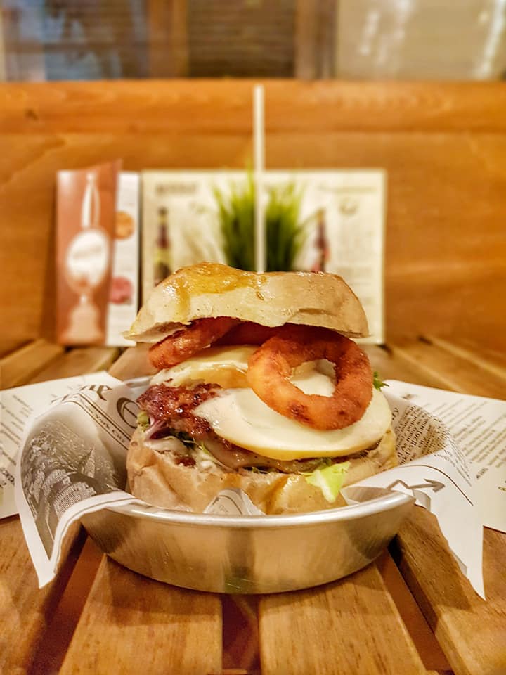 Vista la mia predilizione per i funghi, il primo panino ordinato è stato il panino della settimana: il signore degli anelli. Insalata fresca, provola di bufala, hamburger di scottona, cappello di fungo Pleurotus alla piastra ed anelli di cipolla impanati. Vi sembrano strani questi ultimi come companatico?! Vi assicuro che, nella misura in cui erano inseriti all’interno del panino ( 3 anelli), conferivano al complesso la giusta croccantezza.