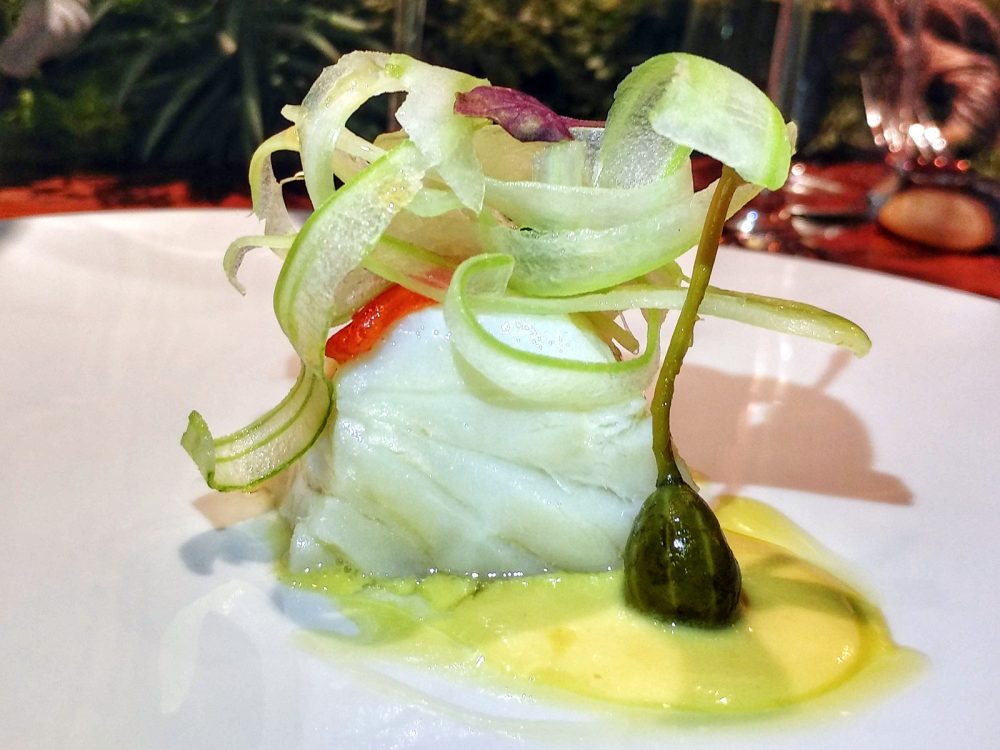Dopo la pasta, il secondo: baccalà norvergese al vapore con petali di pomodoro San Marzano Agro Nocerino-Sarnese DOP, insalatina di sedano fresco sarnese, scorzetta di arancia candita, cremoso di mais, bocciolo di cappero. Il “Pesce Salato” – questo il nome del piatto – è semplicemente perfetto: ottimi equilibri e sapiente trattamento del baccalà.