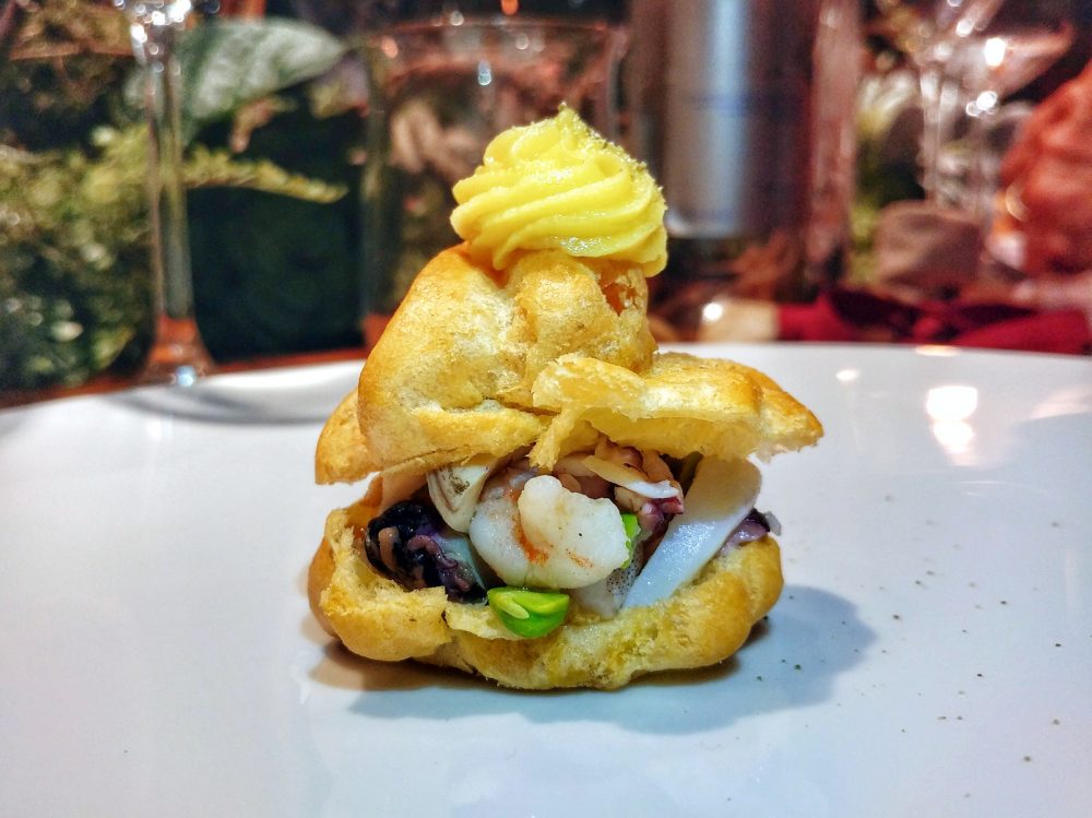 La “Zeppola di San Pietro” è invece una pasta choux cotta al forno farcita con polpo, sconcigli, calamaro e gamberi mediterranei cotti in infuso di fiori spontanei di camomilla, con croccante di piselli freschi e polvere di fave Sarnesi. A donare un tocco di colore e gusto ulteriore – e per richiamare la più celebre zeppola di San Giuseppe – una crema al mango, adagiata con garbo sulla pasta.