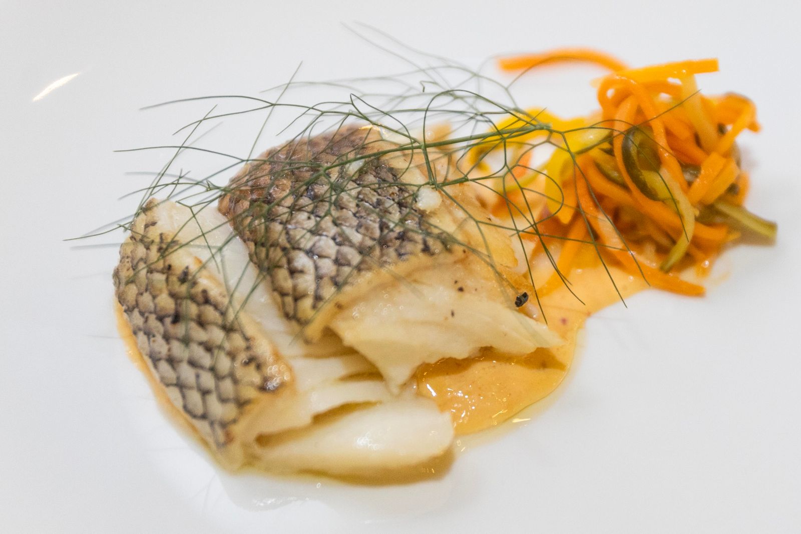 Secondo “trancio di pesce cotto al sale con zucchine alla scapece e cialda