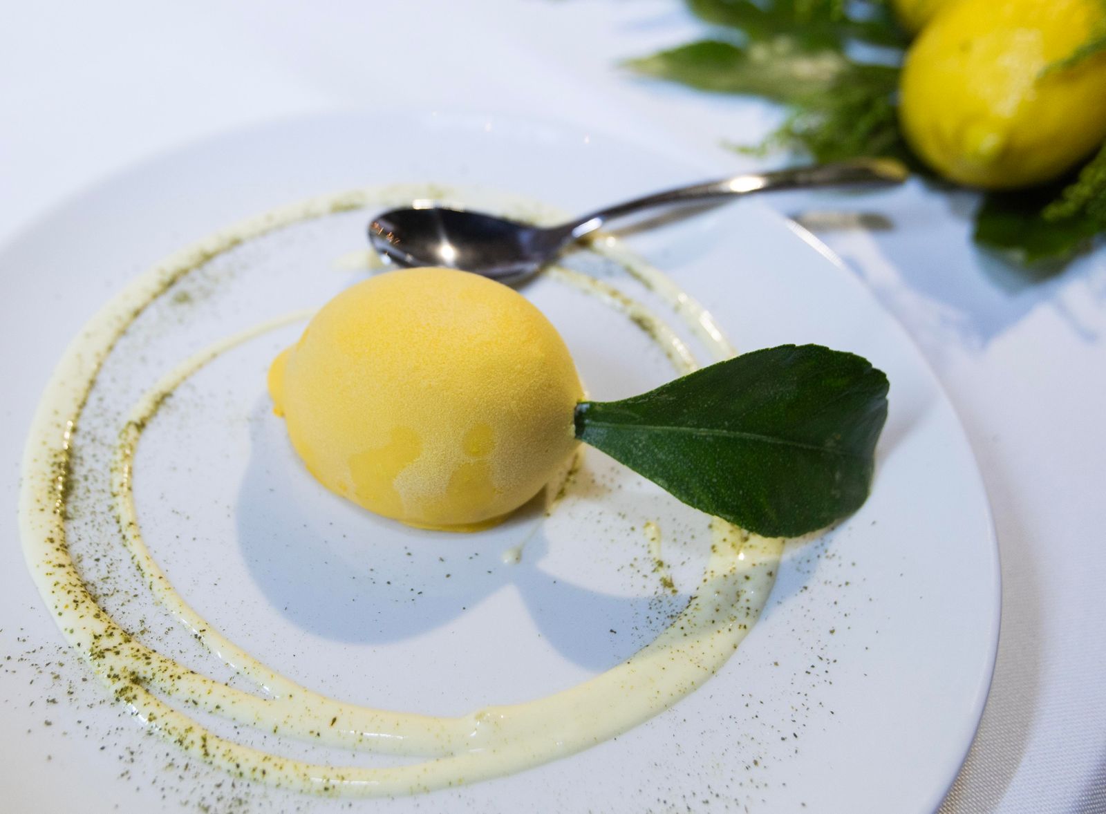 l’evento La Tavola dei 300: Crumble di olio di oliva massese Dop con gelée di arancia bionda e mousse di cioccolato bianco e limone Femminiello Massese e cremoso all’arancio. Un’esaltazione al prodotto tipico di Massa Lubrense, il limone “Femminiello”, e al sole e alle meravigliose temperature del territorio massese.
