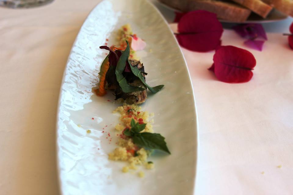 Quattro Passi, alice ripiena fritta su passata di pomodoro, ricotta e pestotortino con verdure cotte, gamberi con le sue uova e tapenade
