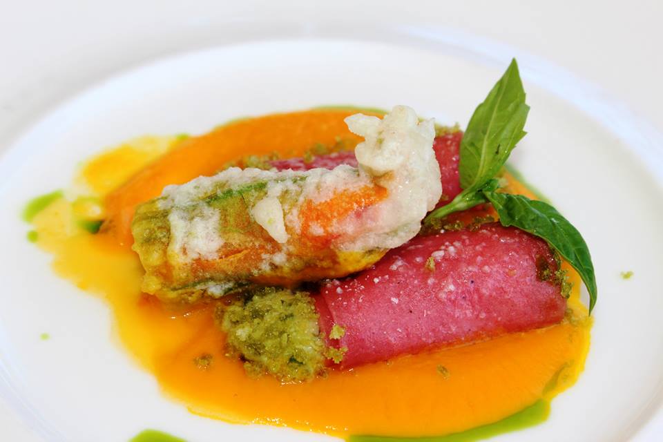 Quattro Passi.Cannellone di barbabietola, con farcitura di zucchine e provola su crema di zucca e gambero avvolto in fiore di zucca in tempura