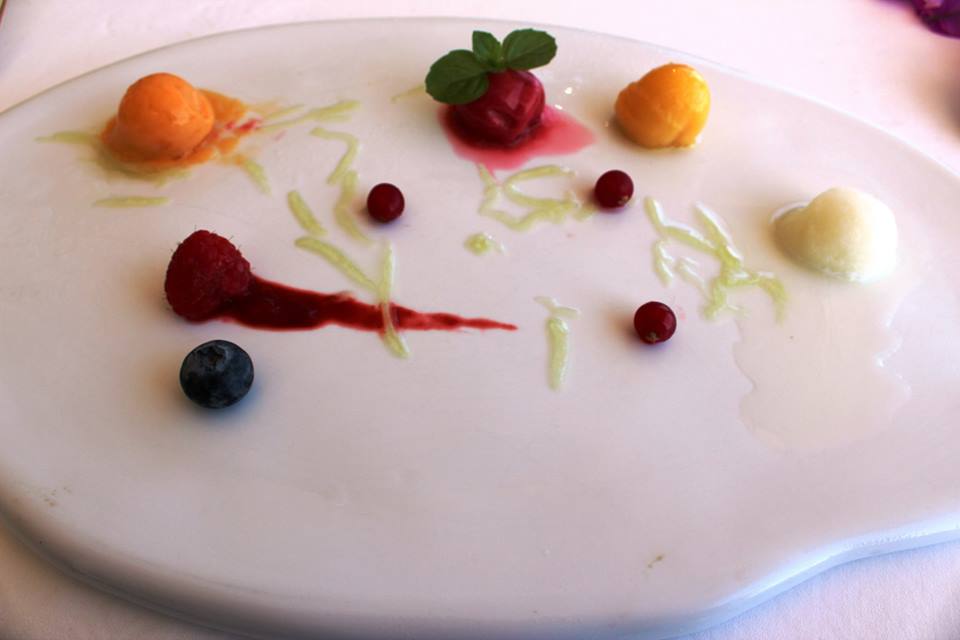 Intriganti i sorbetti, ben fatti con pochissimo zucchero e con l’acidità giusta per un fine pasto.