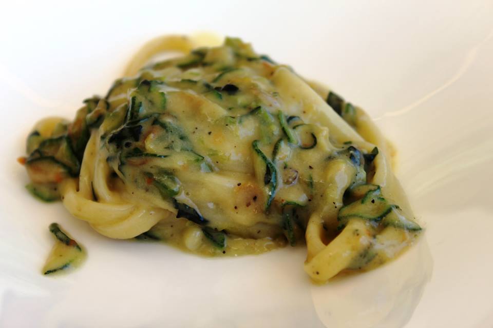 Un piccolo gioiello. Preparazione semplice e veloce, ma con gli accorgimenti maniacali di una grande cucina, perché la mantecatura della pasta con i formaggi avviene lontano dai fornelli in modo da non far filare il formaggio, l’uso della pentola di rame che mantiene il calore, le zucchine sbollentate dopo essere fritte per alleggerire il tutto.