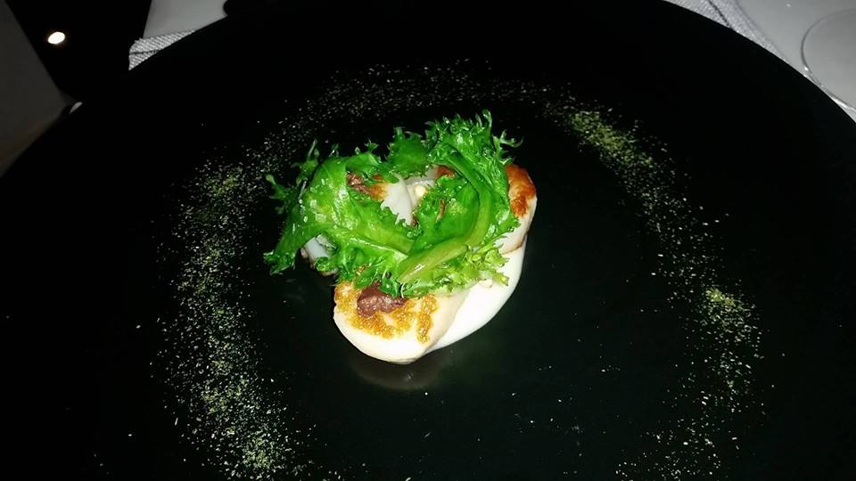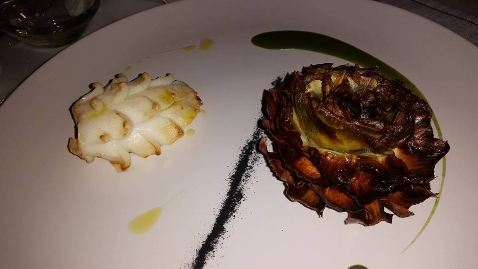 Si continua con altri antipasti, stavolta prettamente di solo pesce con capesante scottate con rapa bianca e scarola saltata con uvetta, pinoli e olive, per ricordare la versione tipicamente napoletana ed una seppia scottata con crema del gambo, dipinto al nero e carciofo cotto in oliocottura e sale Maldon.